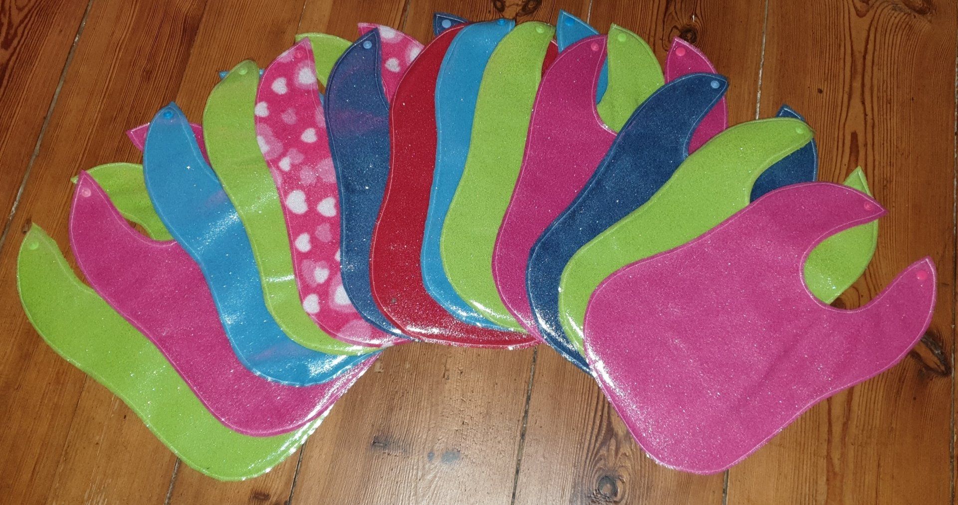 Tolle abwischbare Lätzchen in viele Farben und mit einem Druckknopf zum schließen.